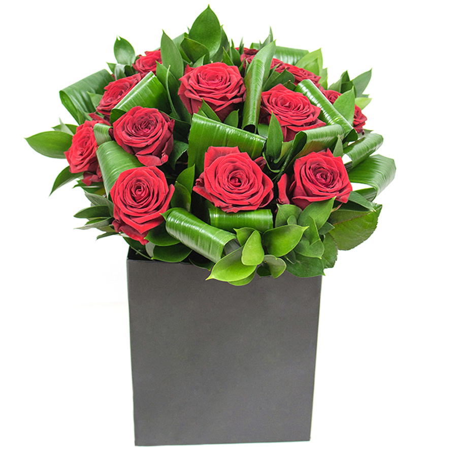 Radiant Sophistication with our beautiful bouquet of vibrant red roses, lush aspidistra leaves, and delicate ruscus. Each flower is hand-picked to ensure the highest level of freshness and quality, creating a truly unique and elegant arrangement.